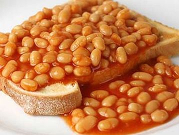 Loaf of fresh bread, butter and Heinz beans served with Orange Juice