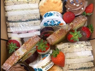 This luxury ribbon tied afternoon tea box contains 3 different types of sandwich (coronation chicken, ham & mustard and cheese & pickle), homemade caramelised onion sausage roll, fruit scone with clotted cream & jam, 2 slices of cake, cutlery and napkin. Served with a selection of teas.